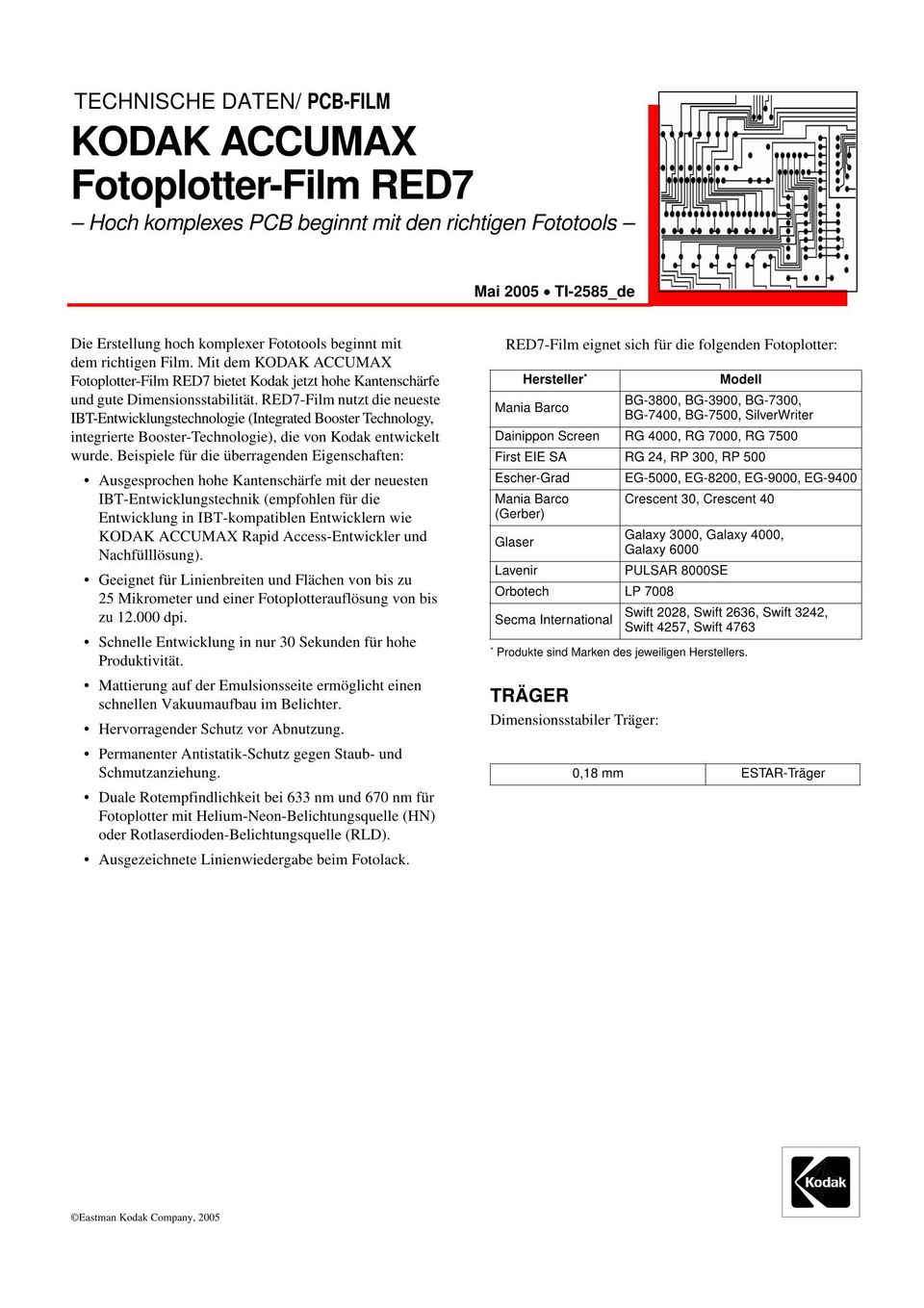 KODAK ACCUMAX Fotoplotter-Film RED7 ist ein rotempfindlicher Film, der für Umgebungen mit hoher Produktivität entwickelt wurde, in denen schnelle Verarbeitungsfunktionen wichtig sind. RED7 Film verwendet die Integrated-Booster-Technologie (IBT-Verarbeitung) für eine extrem scharfe Linienkantenqualität. Ein kratz- und abriebfester Überzug sorgt für eine lange Lebensdauer des Fototools.